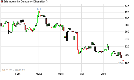 Mit dem Rücksetzer auf 284,00 EUR hat die ERIE INDEMNITY COMPANY-Aktie (ISIN US29530P1021) am 27.06.2025 ein neues 12-Monats-Tief erreicht und damit den Kurs vom 26.06.2025 eingestellt.