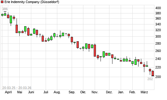 Mit dem Rücksetzer auf 204,00 EUR hat die ERIE INDEMNITY COMPANY-Aktie (ISIN US29530P1021) am 19.03.2026 ein neues 12-Monats-Tief erreicht und damit den Kurs vom 10.03.2026 eingestellt.