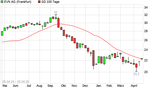 Mit dem Rücksetzer auf 22,10 EUR hat die EVN-Aktie am 24.04.2025 die 100-Tage-Linie nach unten gekreuzt.