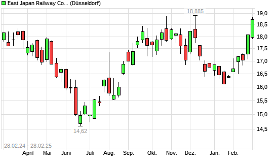 Mit dem Anstieg auf 18,84 EUR hat die East Japan Railway-Aktie (ISIN JP3783600004) am 27.02.2025 ein neues 12-Monats-Hoch erreicht und damit den Kurs vom 03.12.2024 eingestellt.