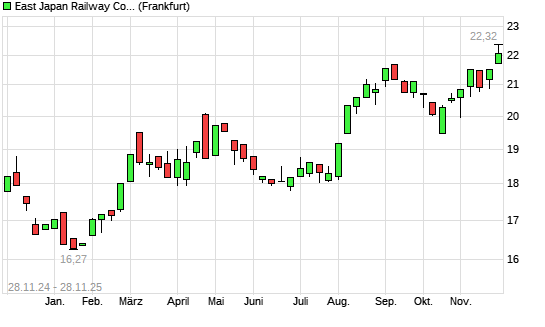 Mit dem Anstieg auf 22,32 EUR hat die East Japan Railway-Aktie (ISIN JP3783600004) am 27.11.2025 ein neues 5-Jahres-Hoch erreicht und damit den Kurs vom 26.11.2025 eingestellt.