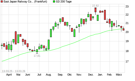 Mit dem Rücksetzer auf 20,26 EUR hat die East Japan Railway-Aktie am 12.03.2026 die 200-Tage-Linie nach unten gekreuzt.