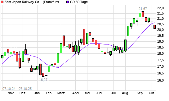 Mit dem Rücksetzer auf 20,44 EUR hat die East Japan Railway-Aktie am 06.10.2025 die 50-Tage-Linie nach unten gekreuzt.