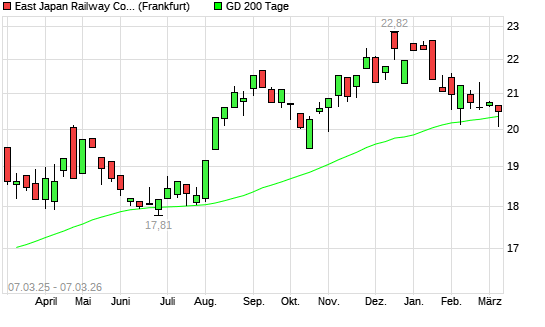 Mit dem Anstieg auf 20,49 EUR hat die East Japan Railway-Aktie am 06.03.2026 die 200-Tage-Linie nach oben gekreuzt.Die East Japan Railway-Aktie befand sich seit dem 03.03.2026 ...weiterlesen