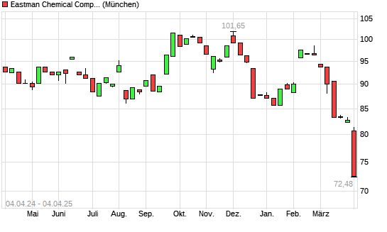 Mit dem Rücksetzer auf 74,76 EUR hat die Eastman Chemical Company-Aktie (ISIN US2774321002) am 03.04.2025 ein neues 12-Monats-Tief erreicht und damit den Kurs vom 31.03.2025 eingestellt.