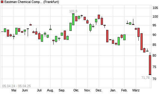 Mit dem Rücksetzer auf 71,78 EUR hat die Eastman Chemical Company-Aktie (ISIN US2774321002) am 04.04.2025 ein neues 12-Monats-Tief erreicht und damit den Kurs vom 03.04.2025 eingestellt.