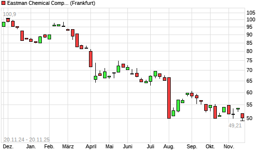 Mit dem Rücksetzer auf 49,44 EUR hat die Eastman Chemical Company-Aktie (ISIN US2774321002) am 19.11.2025 ein neues 5-Jahres-Tief erreicht und damit den Kurs vom 18.11.2025 eingestellt.