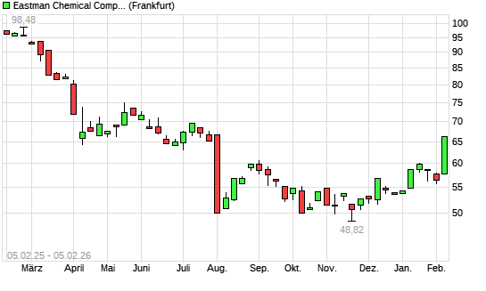 Mit dem Anstieg auf 64,70 EUR hat die Eastman Chemical Company-Aktie (ISIN US2774321002) am 04.02.2026 ein neues 6-Monats-Hoch erreicht und damit den Kurs vom 03.02.2026 eingestellt.