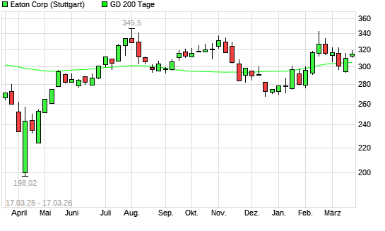 Mit dem Anstieg auf 312,00 EUR hat die Eaton-Aktie am 16.03.2026 die 200-Tage-Linie nach oben gekreuzt.