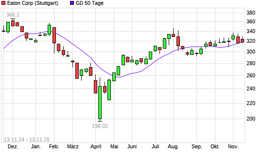 Mit dem Rücksetzer auf 316,70 EUR hat die Eaton-Aktie am 12.11.2025 die 50-Tage-Linie nach unten gekreuzt.