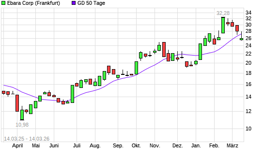 Mit dem Rücksetzer auf 25,90 EUR hat die Ebara-Aktie am 13.03.2026 die 50-Tage-Linie nach unten gekreuzt.Die Ebara-Aktie befindet sich seit dem 26.06.2025 im ...weiterlesen