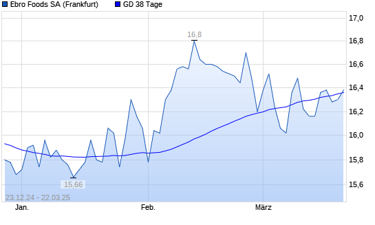 Mit dem Anstieg auf 16,38 EUR hat die Ebro Foods-Aktie am 21.03.2025 die 38-Tage-Linie nach oben gekreuzt.
