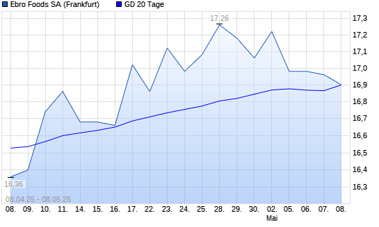 Mit dem Rücksetzer auf 16,96 EUR hat die Ebro Foods-Aktie am 07.05.2025 die 20-Tage-Linie nach unten gekreuzt.