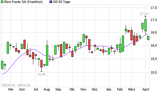 Mit dem Rücksetzer auf 16,22 EUR hat die Ebro Foods-Aktie am 07.04.2025 die 50-Tage-Linie nach unten gekreuzt.