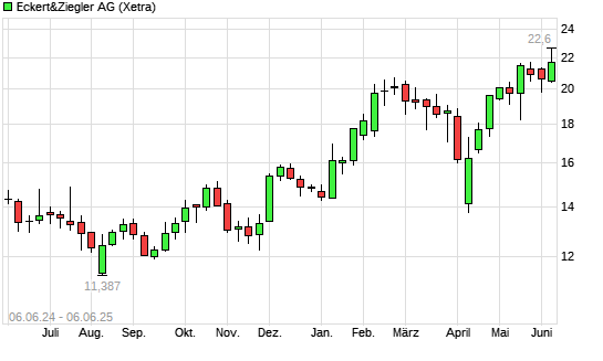Mit dem Anstieg auf 66,95 EUR hat die Eckert&Ziegler-Aktie (ISIN DE0005659700) am 05.06.2025 ein neues 3-Jahres-Hoch erreicht und damit den Kurs vom 04.06.2025 eingestellt.