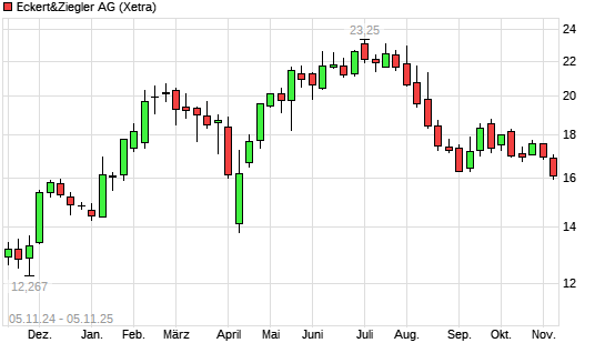 Mit dem Rücksetzer auf 16,41 EUR hat die Eckert&Ziegler-Aktie (ISIN DE0005659700) am 04.11.2025 ein neues 6-Monats-Tief erreicht und damit den Kurs vom 08.09.2025 eingestellt.