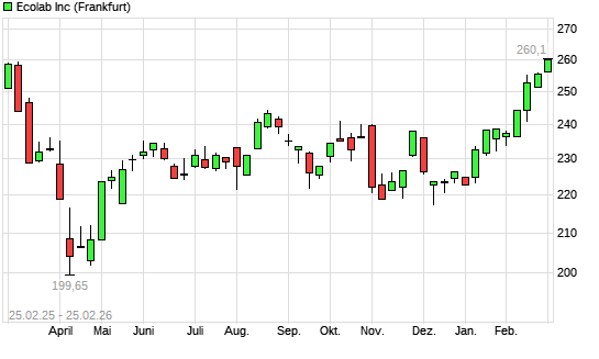 Mit dem Anstieg auf 259,10 EUR hat die Ecolab-Aktie (ISIN US2788651006) am 24.02.2026 ein neues All-Time-High erreicht und damit den Kurs vom 28.02.2025 eingestellt.