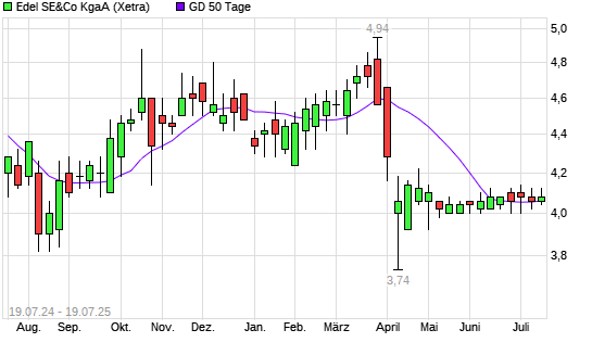 Mit dem Rücksetzer auf 4,00 EUR hat die Edel-Aktie am 18.07.2025 die 50-Tage-Linie nach unten gekreuzt.
