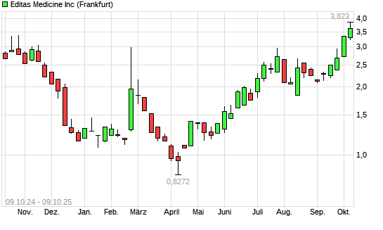 Mit dem Anstieg auf 3,37 EUR hat die Editas Medicine-Aktie (ISIN US28106W1036) am 08.10.2025 ein neues 12-Monats-Hoch erreicht und damit den Kurs vom 22.10.2024 eingestellt.