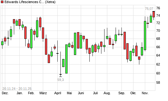 Mit dem Anstieg auf 74,25 EUR hat die Edwards Lifesciences-Aktie (ISIN US28176E1082) am 19.11.2025 ein neues 12-Monats-Hoch erreicht und damit den Kurs vom 14.11.2025 eingestellt.