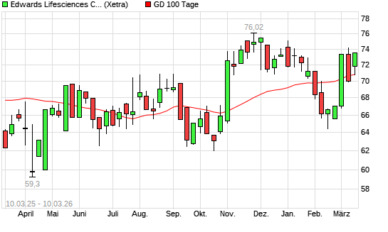 Mit dem Anstieg auf 72,37 EUR hat die Edwards Lifesciences-Aktie am 09.03.2026 die 100-Tage-Linie nach oben gekreuzt.