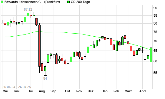 Mit dem Anstieg auf 66,53 EUR hat die Edwards Lifesciences-Aktie am 25.04.2025 die 200-Tage-Linie nach oben gekreuzt.