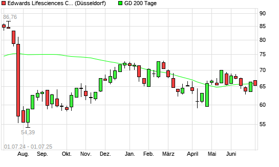 Mit dem Anstieg auf 66,70 EUR hat die Edwards Lifesciences-Aktie am 30.06.2025 die 200-Tage-Linie nach oben gekreuzt.