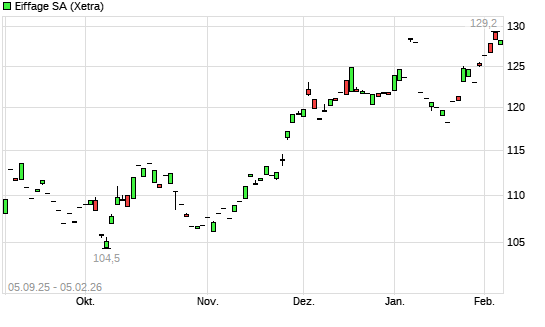 Mit dem Anstieg auf 129,45 EUR hat die Eiffage-Aktie (ISIN FR0000130452) am 04.02.2026 ein neues All-Time-High erreicht und damit den Kurs vom 20.05.2025 eingestellt.