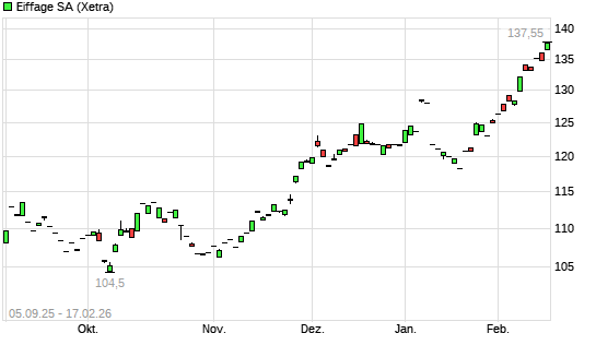 Mit dem Anstieg auf 138,90 EUR hat die Eiffage-Aktie (ISIN FR0000130452) am 16.02.2026 ein neues All-Time-High erreicht und damit den Kurs vom 13.02.2026 eingestellt.
