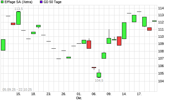 Mit dem Rücksetzer auf 110,35 EUR hat die Eiffage-Aktie am 21.10.2025 die 50-Tage-Linie nach unten gekreuzt.
