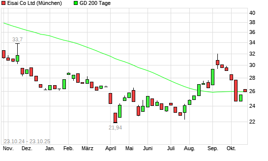 Mit dem Rücksetzer auf 25,67 EUR hat die Eisai-Aktie am 22.10.2025 die 200-Tage-Linie nach unten gekreuzt.