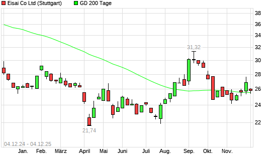 Mit dem Rücksetzer auf 25,34 EUR hat die Eisai-Aktie am 03.12.2025 die 200-Tage-Linie nach unten gekreuzt.