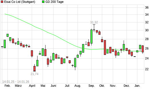 Mit dem Rücksetzer auf 25,18 EUR hat die Eisai-Aktie am 13.01.2026 die 200-Tage-Linie nach unten gekreuzt.