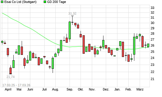 Mit dem Rücksetzer auf 25,55 EUR hat die Eisai-Aktie am 16.03.2026 die 200-Tage-Linie nach unten gekreuzt.