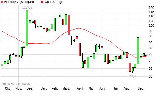 Mit dem Rücksetzer auf 70,46 EUR hat die Elastic-Aktie am 17.09.2025 die 100-Tage-Linie nach unten gekreuzt.