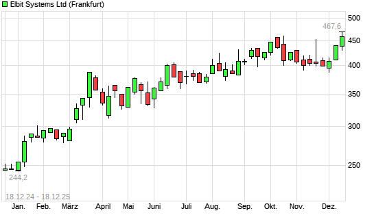 Mit dem Anstieg auf 460,00 EUR hat die Elbit Systems-Aktie (ISIN IL0010811243) am 17.12.2025 ein neues All-Time-High erreicht und damit den Kurs vom 18.11.2025 eingestellt.