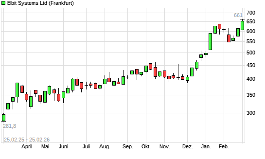 Mit dem Anstieg auf 644,50 EUR hat die Elbit Systems-Aktie (ISIN IL0010811243) am 24.02.2026 ein neues All-Time-High erreicht und damit den Kurs vom 23.02.2026 eingestellt.