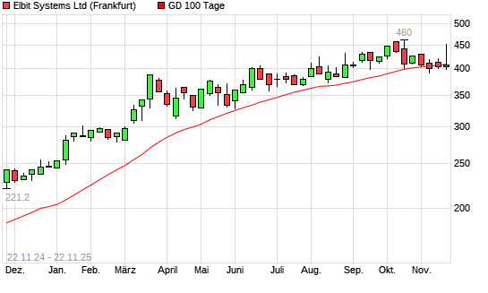 Mit dem Rücksetzer auf 400,40 EUR hat die Elbit Systems-Aktie am 21.11.2025 die 100-Tage-Linie nach unten gekreuzt.