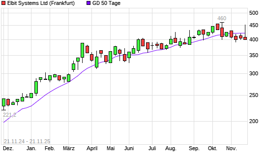 Mit dem Rücksetzer auf 418,20 EUR hat die Elbit Systems-Aktie am 20.11.2025 die 50-Tage-Linie nach unten gekreuzt.
