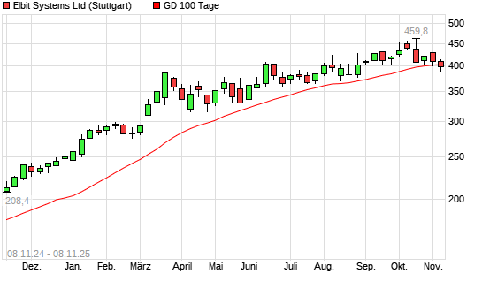 Mit dem Rücksetzer auf 394,20 EUR hat die Elbit Systems-Aktie am 07.11.2025 die 100-Tage-Linie nach unten gekreuzt.Der Abstand zur 200-Tage-Linie beträgt ...weiterlesen