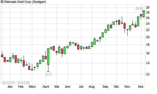 Mit dem Anstieg auf 27,76 EUR hat die Eldorado Gold-Aktie (ISIN CA2849025093) am 09.12.2025 ein neues 5-Jahres-Hoch erreicht und damit den Kurs vom 01.12.2025 eingestellt.