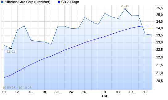 Mit dem Rücksetzer auf 23,59 EUR hat die Eldorado Gold-Aktie am 09.10.2025 die 20-Tage-Linie nach unten gekreuzt.