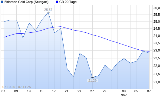 Mit dem Rücksetzer auf 22,78 EUR hat die Eldorado Gold-Aktie am 06.11.2025 die 20-Tage-Linie nach unten gekreuzt.