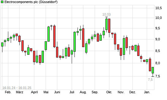 Mit dem Rücksetzer auf 7,51 EUR hat die Electrocomponents-Aktie (ISIN GB0003096442) am 15.01.2025 ein neues 12-Monats-Tief erreicht und damit den Kurs vom 13.01.2025 eingestellt.