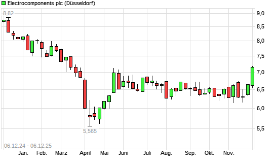 Mit dem Anstieg auf 7,01 EUR hat die Electrocomponents-Aktie (ISIN GB0003096442) am 05.12.2025 ein neues 6-Monats-Hoch erreicht und damit den Kurs vom 10.06.2025 eingestellt.