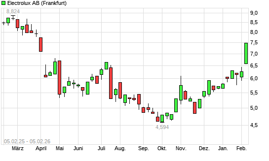 Mit dem Anstieg auf 7,25 EUR hat die Electrolux B-Aktie (ISIN SE0016589188) am 04.02.2026 ein neues 6-Monats-Hoch erreicht und damit den Kurs vom 03.02.2026 eingestellt.