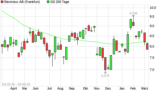Mit dem Rücksetzer auf 8,14 EUR hat die Electrolux B-Aktie am 03.03.2025 die 200-Tage-Linie nach unten gekreuzt.