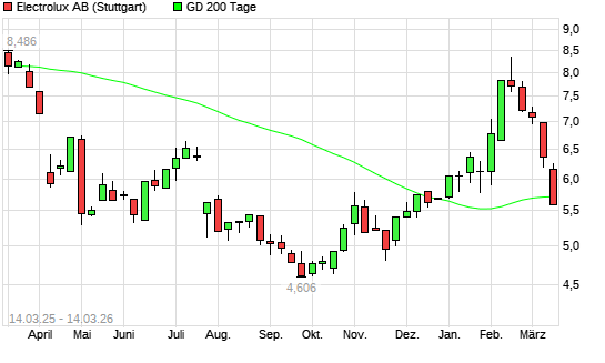 Mit dem Rücksetzer auf 5,66 EUR hat die Electrolux B-Aktie am 13.03.2026 die 200-Tage-Linie nach unten gekreuzt.