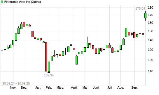 Mit dem Anstieg auf 172,20 EUR hat die Electronic Arts-Aktie (ISIN US2855121099) am 29.09.2025 ein neues All-Time-High erreicht und damit den Kurs vom 22.11.2024 eingestellt.