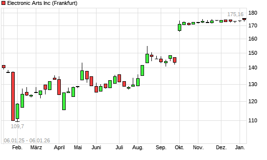 Mit dem Anstieg auf 175,16 EUR hat die Electronic Arts-Aktie (ISIN US2855121099) am 05.01.2026 ein neues All-Time-High erreicht und damit den Kurs vom 05.11.2025 eingestellt.
